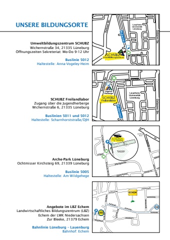 Unsere BildungsorteUmweltbildungszentrum SCHUBZWichernstra%u00dfe 34, 21335 L%u00fcneburg%u00d6ffnungszeiten Sekreteriat: Mo-Do 9-12 UhrBuslinie 5012Haltestelle: Anna-Vogeley-HeimSCHUBZ FreilandlaborZugang %u00fcber die JugendherbergeWichernstra%u00dfe 6, 21335 L%u00fcneburgBuslinien 5011 und 5012Haltestelle: Scharnhorststra%u00dfe/DJHArche-Park L%u00fcneburgOchtmisser Kirchsteig 69, 21339 L%u00fcneburgBuslinie 5005Haltestelle: Am WildgehegeAngebote im LBZ EchemLandwirtschaftliches Bildungszentrum (LBZ)Echem der LWK NiedersachsenZur Bleeke, 21379 EchemBahnlinie L%u00fcneburg %u2013 LauenburgBahnhof: EchemWichernstr.LBZ Dorfstra%u00dfeLandesstra%u00dfeLerchenwegB%u00e4ckerstra%u00dfeUhlenbuschUhlenbuschDorfstra%u00dfeDorfstra%u00dfeZur BleekeZur BleekeLandesstra%u00dfeAn der KircheJugendHerbergeWichernstr.Am Wildgeh.ZeltbergHamburger Stra%u00dfeOchtmisser KirchsteigOchtmisser KirchsteigSt%u00f6teroggestra%u00dfeHamburger Stra%u00dfe