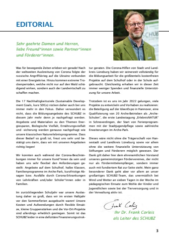3Was f%u00fcr bewegende Zeiten erleben wir gerade! Nach der weltweiten Ausbreitung von Corona folgte der russische Angriffskrieg auf die Ukraine verbunden mit einer Energiekrise. Hinzu kommen extreme Trockenperioden, welche nicht nur auf den Wald sch%u00e4digend wirken, sondern auch der Landwirtschaft zu schaffen machen.Die 17 Nachhaltigkeitsziele (Sustainable Development Goals, kurz SDGs) r%u00fccken daher auch bei uns immer mehr in den Fokus. Daher verwundert es nicht, dass die Bildungsangebote des SCHUBZ in diesem Jahr mehr denn je nachgefragt werden. Angebote und Materialien zu den Themen Energiesparen, Biologische Vielfalt, Ern%u00e4hrungsvielfalt und -sicherung werden genauso nachgefragt wie unsere klassischen Naturerlebnisprogramme. Dass dieser Bedarf so gro%u00df ist, freut uns sehr und best%u00e4tigt uns darin, dass wir mit unseren Angeboten richtig liegen! Wir konnten auch w%u00e4hrend der Corona-Beschr%u00e4nkungen immer f%u00fcr unsere Kund*innen da sein und haben uns sehr flexibel den Anforderungen gestellt: Angebote auf dem Schulhof, halbe Klassen, Familienprogramme im Arche-Park, kurzfristige Absagen bzw. Ausf%u00e4lle durch Corona-Erkrankungen von Lehrkr%u00e4ften und/oder Sch%u00fcler*innen oder in Familien. Im zur%u00fcckliegenden Schuljahr war unsere Auslastung daher so gro%u00df, dass wir im ersten Halbjahr vor den Sommerferien ausgebucht waren! Unsere Kosten und Aufwendungen durch flexible Eins%u00e4tze, kleine Gruppenst%u00e4rken und die Vor-Ort-Projekte sind allerdings erheblich gestiegen. Somit ist das SCHUBZ leider in eine defizit%u00e4re FinanzierungsstrukIhr Dr. Frank Corleis als Leiter des SCHUBZEditorialtur geraten. Die Corona-Hilfen von Stadt und Landkreis L%u00fcneburg haben wir seinerzeit vollst%u00e4ndig f%u00fcr die Bildungsarbeit f%u00fcr die gr%u00f6%u00dftenteils kostenfreien Projekte auf dem Schulhof oder in der Schule aufgebraucht. Gleichzeitig erhalten wir in dieser Zeit immer weniger Spenden und finanzielle Unterst%u00fctzung f%u00fcr unsere Arbeit.Trotzdem ist es uns im Jahr 2022 gelungen, viele Projekte zu entwickeln und Vorhaben zu realisieren: die Beteiligung auf der IdeenExpo in Hannover, eine Qualifizierung von 20 Arche-Betrieben als %u201eArcheSchulen%u201c, die erste Landestagung %u201eErlebnisNATUR%u201c in Schneverdingen, der Start von Ferienprogrammen mit der Stadtjugendpflege sowie zahlreiche Erweiterungen im Arche-Park. Dieses w%u00e4re nicht ohne die Tr%u00e4gerschaft von Hansestadt und Landkreis L%u00fcneburg sowie vor allem ohne die weitere finanzielle Unterst%u00fctzung von Stiftungen und F%u00f6rderern m%u00f6glich gewesen. Der Dank gilt daher hier dem ehrenamtlichen Vorstand unseres gemeinn%u00fctzigen F%u00f6rdervereines, der nicht nur als F%u00f6rdermittelempf%u00e4nger, sondern immer auch mit fundiertem Rat zur Seite steht. Mein ganz besonderer Dank geht aber vor allem an unser gro%u00dfartiges SCHUBZ-Team, das unerm%u00fcdlich bei Wind und Wetter an sieben Tagen in der Woche im p%u00e4dagogischen Einsatz zum Wohle der Kinder und Jugendlichen sowie bei der Tierversorgung und in der Verwaltung aktiv ist.Sehr geehrte Damen und Herren, liebe Freund*innen sowie Partner*innenund F%u00f6rderer*innen.