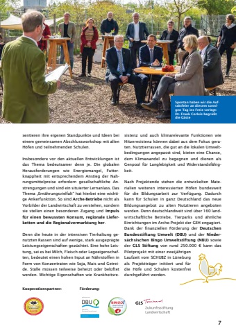 7Kooperationspartner: F%u00f6rderung:sentieren ihre eigenen Standpunkte und Ideen bei einem gemeinsamen Abschlussworkshop mit allen H%u00f6fen und teilnehmenden Schulen. Insbesondere vor den aktuellen Entwicklungen ist das Thema bedeutsamer denn je. Die globalen Herausforderungen wie Energiemangel, Futterknappheit mit entsprechendem Anstieg der Nahrungsmittelpreise erfordern gesellschaftliche Anstrengungen und sind ein situierter Lernanlass. Das Thema %u201eErn%u00e4hrungsvielfalt%u201c hat hierbei eine wichtige Ankerfunktion. So sind Arche-Betriebe nicht als Vorbilder der Landwirtschaft zu verstehen, sondern sie stellen einen besonderen Zugang und Impuls f%u00fcr einen bewussten Konsum, regionale Lieferketten und die Regionalvermarktung her. Denn die heute in der intensiven Tierhaltung genutzten Rassen sind auf wenige, stark ausgepr%u00e4gte Leistungseigenschaften gez%u00fcchtet. Eine hohe Leistung, sei es bei Milch, Fleisch oder Legeeigenschaften, bedeutet einen hohen Input an N%u00e4hrstoffen in Form von Konzentraten wie Soja, Mais und Getreide. St%u00e4lle m%u00fcssen teilweise beheizt oder bel%u00fcftet werden. Wichtige Eigenschaften wie Krankheitsresistenz und auch klimarelevante Funktionen wie Hitzeresistenz k%u00f6nnen dabei aus dem Fokus geraten. Nutztierrassen, die gut an die lokalen Umweltbedingungen angepasst sind, bieten eine Chance, dem Klimawandel zu begegnen und dienen als Genpool f%u00fcr Langlebigkeit und Widerstandsf%u00e4higkeit.Nach Projektende stehen die entwickelten Materialien weiteren interessierten H%u00f6fen bundesweit f%u00fcr die Bildungsarbeit zur Verf%u00fcgung. Dadurch kann f%u00fcr Schulen in ganz Deutschland das neue Bildungsangebot zu alten Nutztieren angeboten werden. Denn deutschlandweit sind %u00fcber 160 landwirtschaftliche Betriebe, Tierparks und %u00e4hnliche Einrichtungen im Arche-Projekt der GEH engagiert. Dank der finanziellen F%u00f6rderung der Deutschen Bundesstiftung Umwelt (DBU) und der Nieders%u00e4chsischen Bingo Umweltstiftung (NBU) sowie der GLS Stiftung von rund 250.000 %u20ac kann das Pilotprojekt mit einer zweij%u00e4hrigen Laufzeit vom SCHUBZ in L%u00fcneburg als Projekttr%u00e4ger initiiert und f%u00fcr die H%u00f6fe und Schulen kostenfrei durchgef%u00fchrt werden.Spontan haben wir die Auftaktfeier an diesem sonnigen Tag ins Freie verlegt: Dr. Frank Corleis begr%u00fc%u00dft die G%u00e4ste